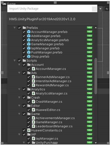 例如,如果你想使用广告工具包,你应该添加'AdsManager‘预制件。AdsManager预置程序有不同的脚本,如RewardAdManager、InterstitalAdManager、BannerAdManager。您需要在场景中部署所需的HMS工具包预制件。