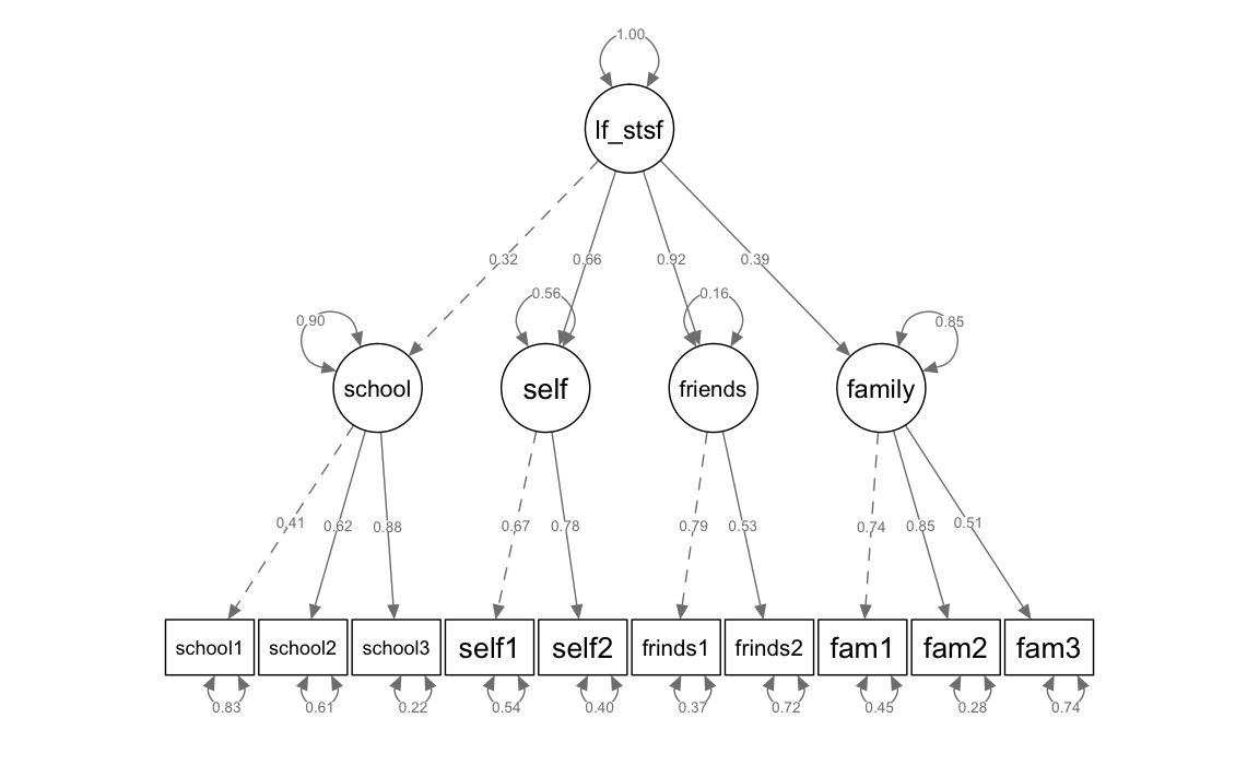 我正在拉瓦安做二级终审法院来测量智力。几个智力测试(底层)加载到因素(中等水平,例如工作记忆),加载到一般因素(顶级,称为g因子)。我的代码如下所示: