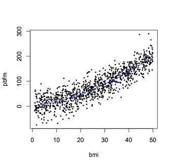 pbfm <- 1.5*bmi + 0.05*bmi^2 +rnorm(1000,0,30)