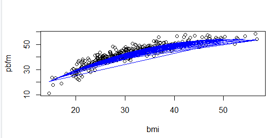 lines(bmi, predict(mod3),col="blue",lwd=0.02)