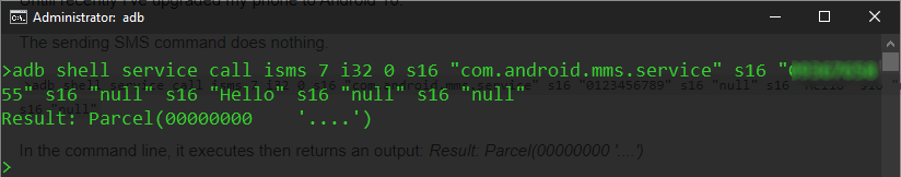我有一个C#应用程序,它执行亚行命令发送短信。它在Android 8(三星手机)上运行得很好。