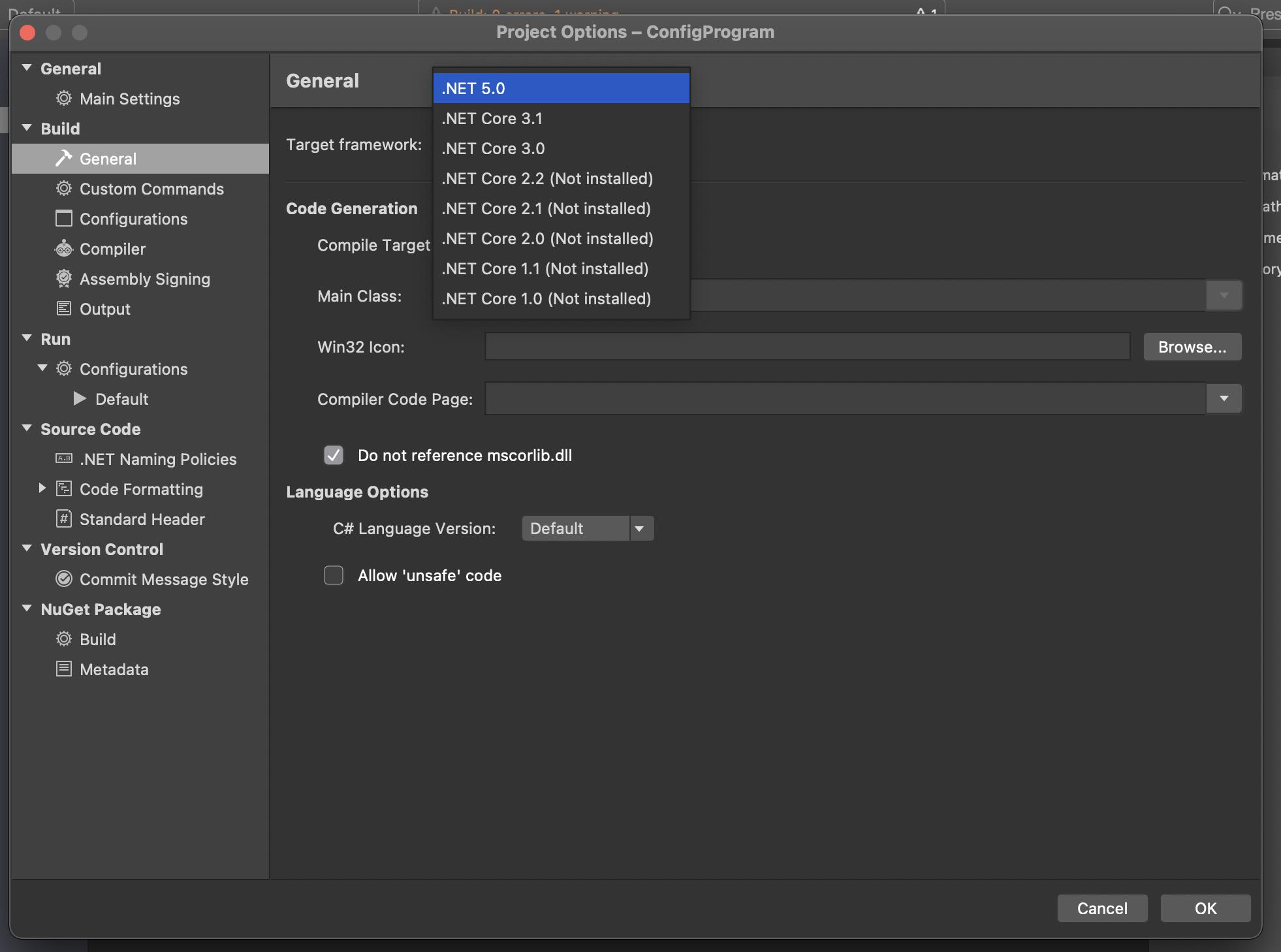 然后单击OK,然后重新显示它恢复到.NET Core3.0的选项。