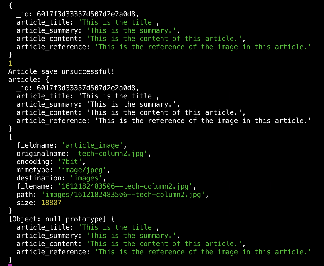 });但是,当我在邮递员上传递邮件请求时,它失败了,出现了一个400个错误,上面写着“不好的请求”。如您所见,在上面的代码中,我有许多console.logs,它们显示了req.file和req.body以及文章的值。当我查看我的控制台时,它会显示这些值不包括article_image.。下面是console.logs的照片: