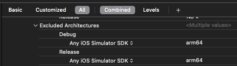 arm64添加到Excluded ArchitecturesBuild Active Architecture Only标记为Release构建。即使我在运行在M1 Mac上的arm64架构下编译我的应用程序时,我也不完全理解上面的内容是否必要,因为该解决方案似乎只适用于不支持arm64模拟器的Intel,就像Intel一样,模拟器可能运行在x86_64中,而不是arm64上,所以解决方案1不适用于我的情况。