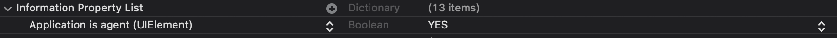 将"Application (UIElement)“设置为在info.plist中创建一个窗口,而不创建菜单栏。这就是我想要的行动。