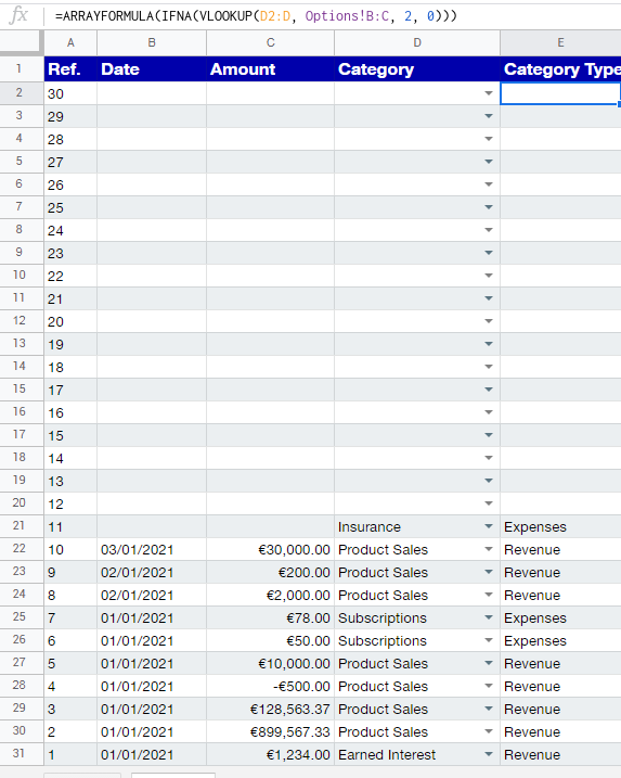 I有一个选项表,它根据事务的类型对其进行分类。在事务表中,我添加具有相应类别的事务,并试图创建一个公式,其中相应的类别类型将自动添加到其旁边的列中。