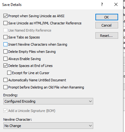 EmEditor有一个可以用缩进空格替换(或不替换)制表符的配置(行的开头),但这是not my spaces。即使在未选中此框的情况下,我也注意到,如果我的文本内容与制表符混合在一起(行首部分除外),则编辑和保存文档时,所有选项卡都将替换为空格。我怎样才能防止这种行为?我怀疑这是一个配置,但我找不到它。版本20.4.4在Windows 64位上。