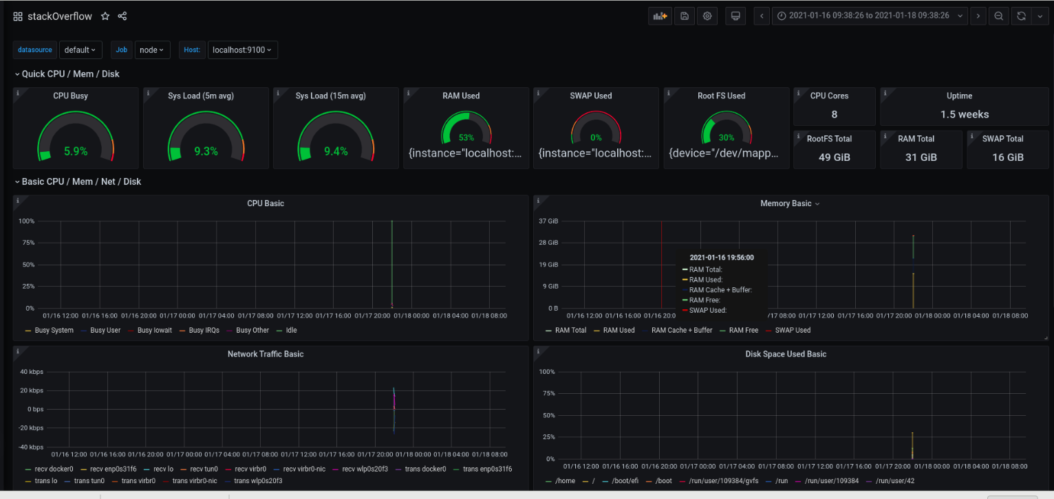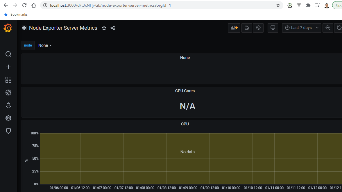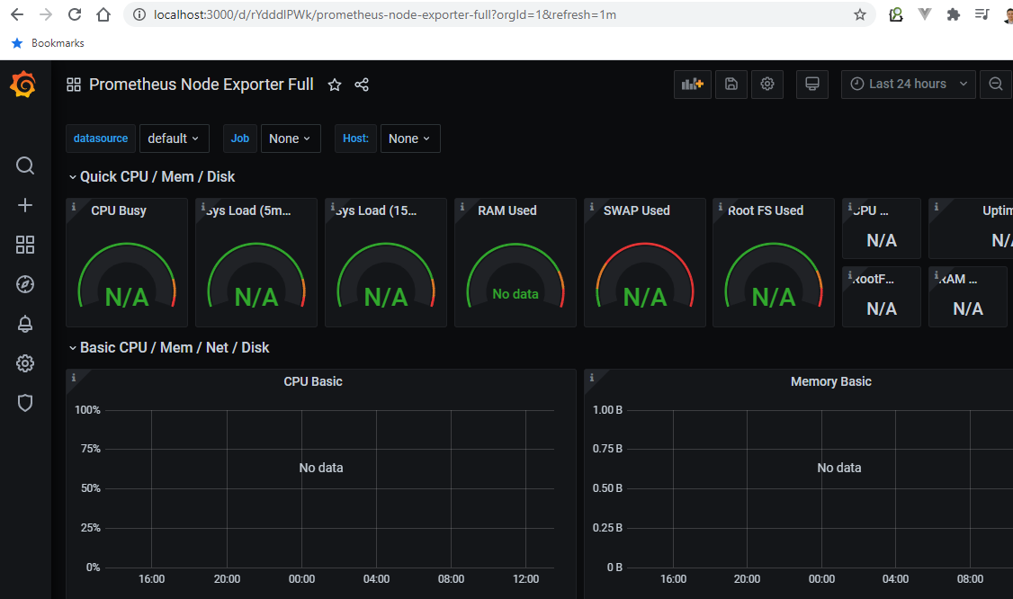 我已经成功地在3000端口本地运行了Grafana,然后使用Import via grafana.com进行1860和405 id的默认模板和数据。但问题是没有可用的数据。