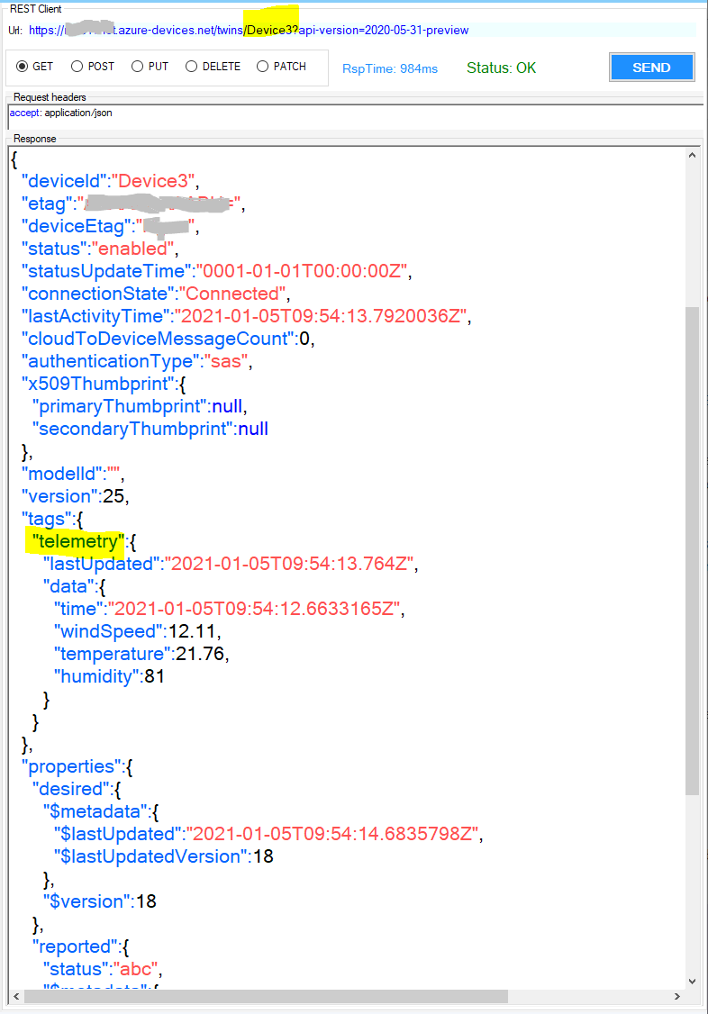 使用休息一下,去找双胞胎,我们可以获得特定设备的设备孪生点,请参见下面的示例: