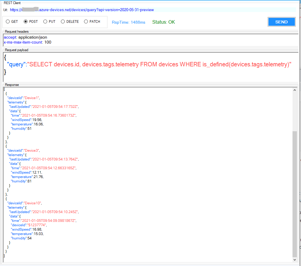 SELECT devices.id, devices.tags.telemetry FROM devices WHERE is_defined(devices.tags.telemetry)使用REST获取装置,我们可以获得查询字符串的结果,请参见下面的示例:
