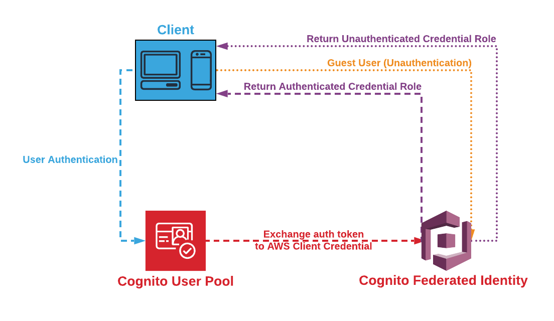 IdentityId是每个联邦标识角色的唯一ID,可以对任何未经身份验证的角色进行身份验证。我们将调用CognitoIdentityCredentials将令牌与aws凭据交换为经过身份验证的角色。一旦用户拥有了凭据,他们就会包含AWS.config.credentials和identityId。