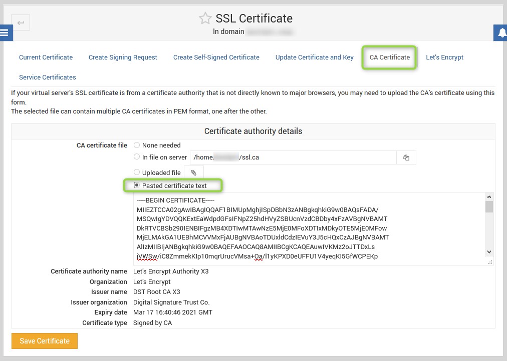 Virtualmin -> Server Configuration -> SSL Certificate -> CA Certificate- Option 1: Choose `upload file` and use [lets-encrypt-r3-cross-signed.pem](https://letsencrypt.org/certs/lets-encrypt-r3-cross-signed.pem)