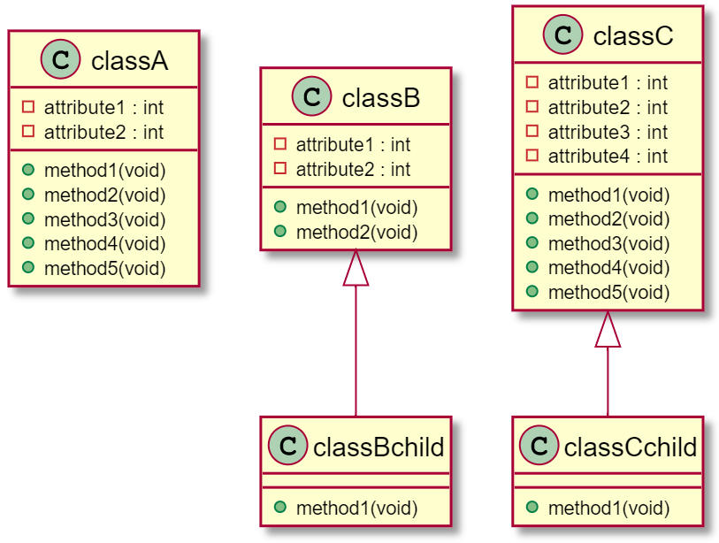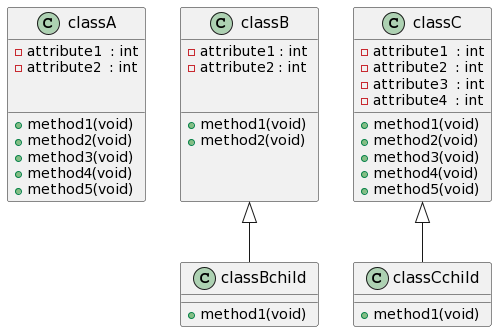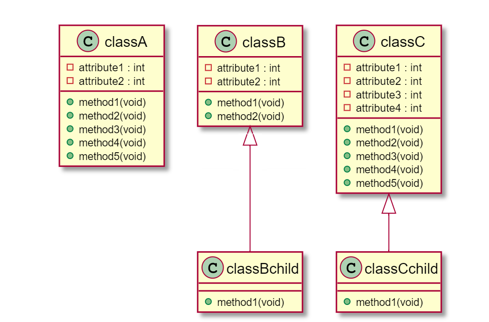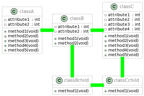 在所附的UML图中有5个类,我想了解类A、B和C的顶部是如何垂直对齐的,而子类保持对齐。请在下面找到我的UML代码和我的截图。
