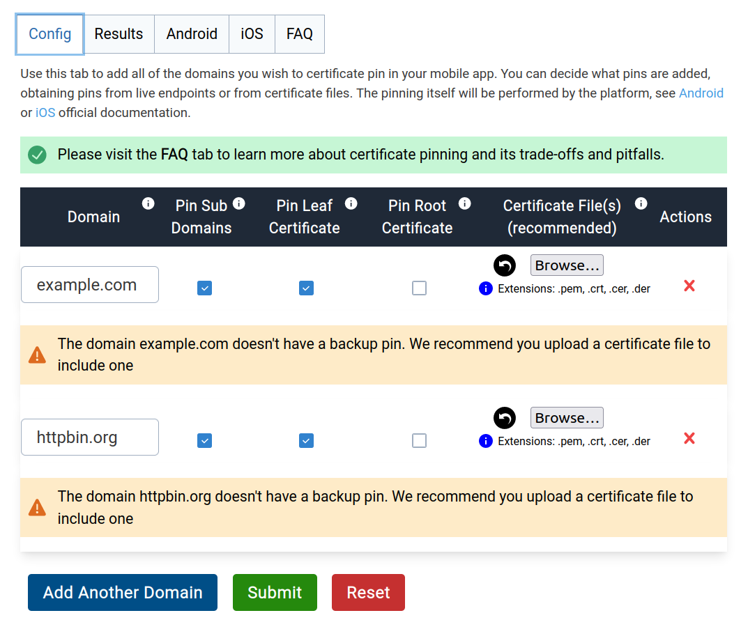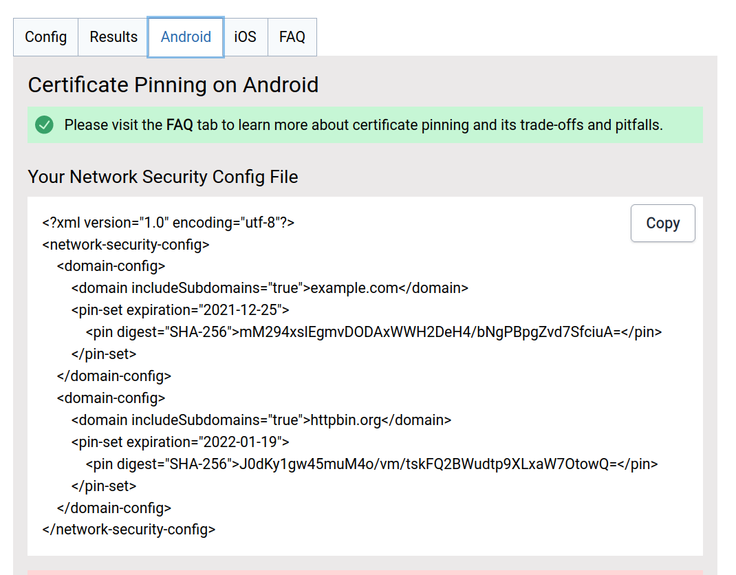 幸运的是,我们现在有了一个在线免费工具来帮助我们防止这类错误。移动证书钉扎发生器将给我们一个准备使用network_security_config.xml