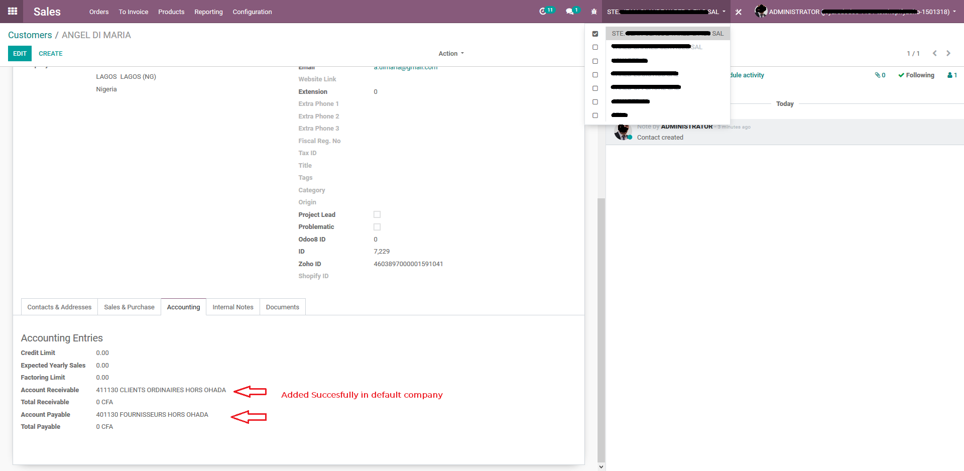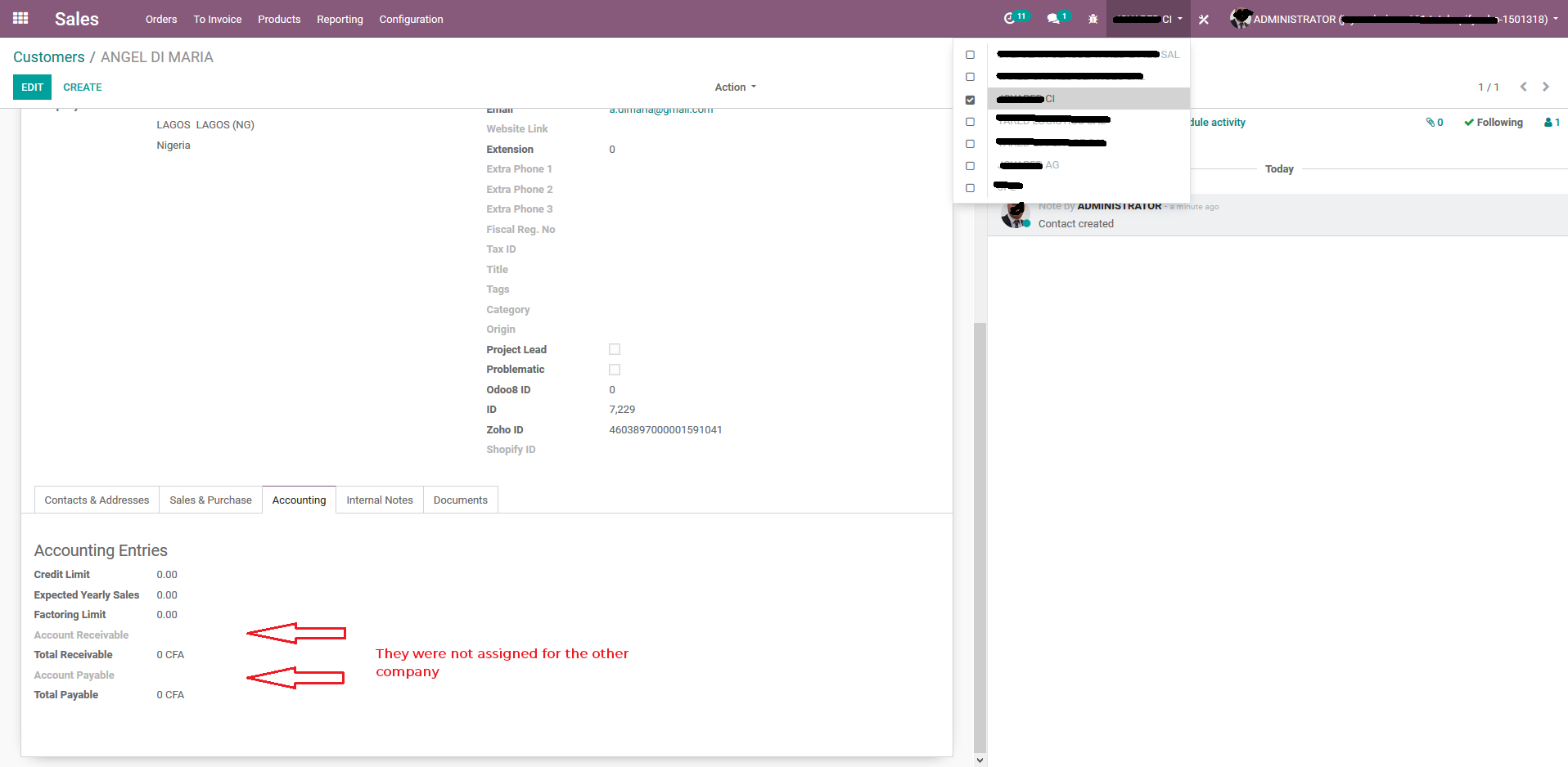 我试图通过API为Odoo的合作伙伴添加应付款和应收账款字段。但是,它们只应用于默认的公司。我希望下面的图片澄清。