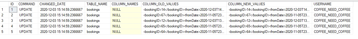 INSERT INTO ChangeLog (COMMAND, CHANGED_DATE, TABLE_NAME, COLUMN_NAMES, COLUMN_OLD_VALUES, COLUMN_NEW_VALUES, USERNAME)