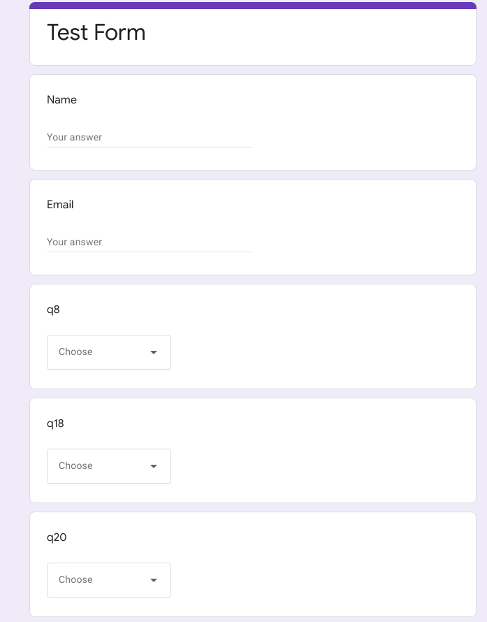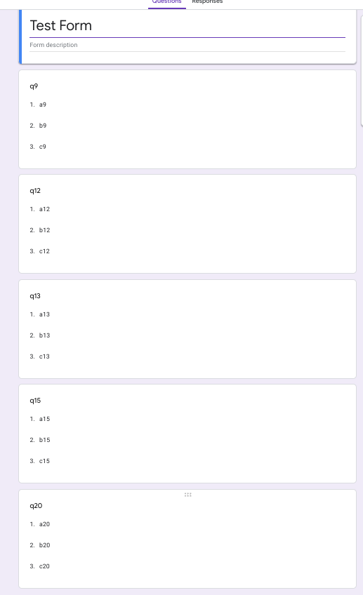 我正在制作一个Google表单,我想给它添加一些问题,但是这些问题应该是从随机抽取的,这些问题将出现在Google 中。为此需要做些什么?例如:我想从Google工作表中显示出20个问题库中的5个随机问题
