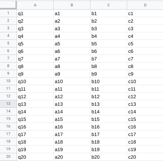 其中A是问题,后面的列是选项。注意:如果您只需要生成没有任何选项的问题,您可以选择将其从工作表中删除。我包括了选项,因为这将是最坏的情况在你的问题。