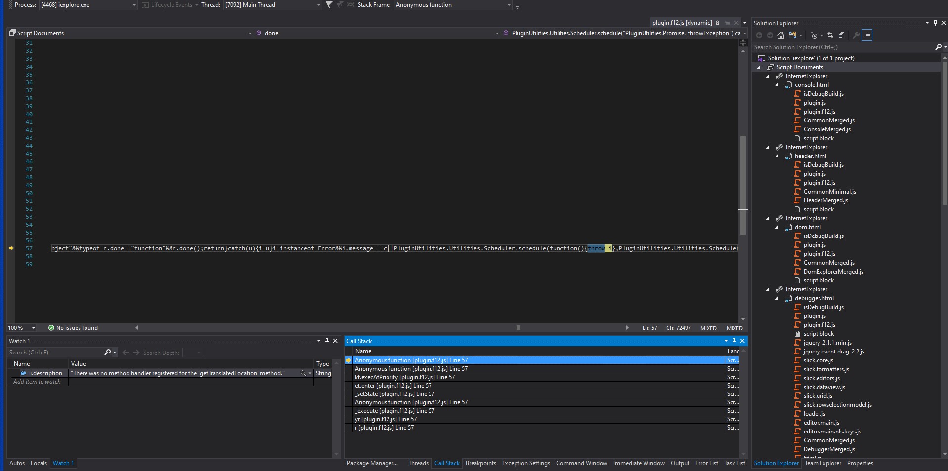 解决方案是在IE11设置中设置复选框“禁用调试(Internet )”和“禁用调试(其他)”。