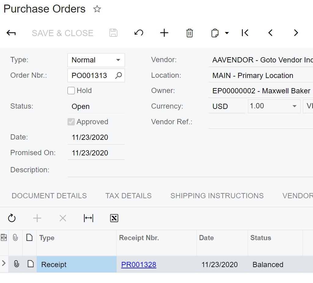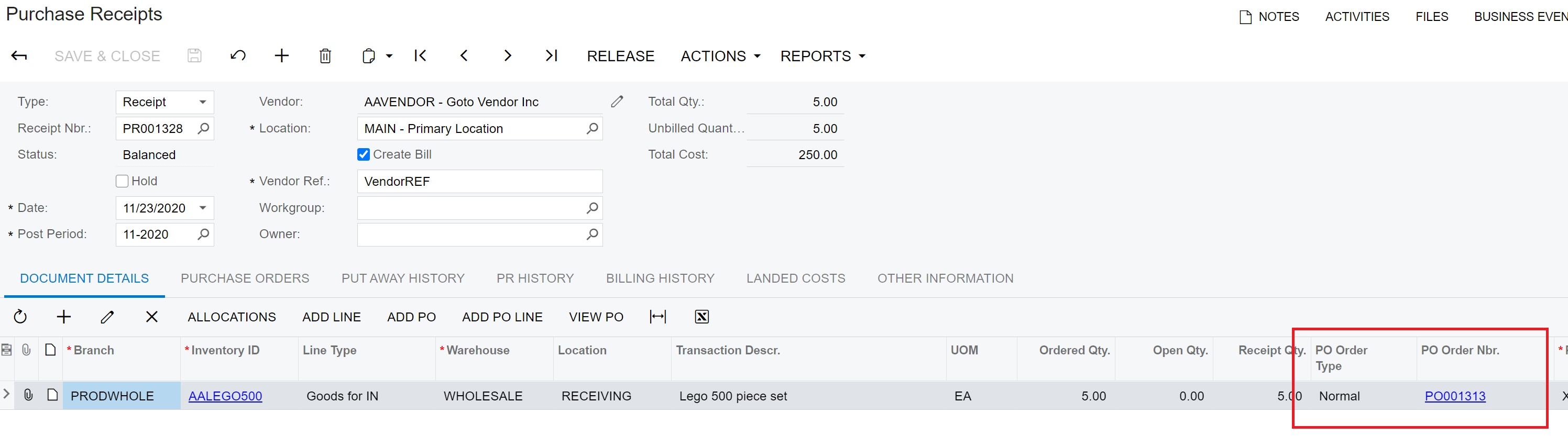 我正在使用rest通过我自己的自定义端点创建PO收据。我可以创建收据和添加行ok,甚至分配一个PO Nbr,线Nbr等,以及行。但是,当我在Acumatica中查看PO收据时,PO收据订单链接不会出现在“购买订单”选项卡下。