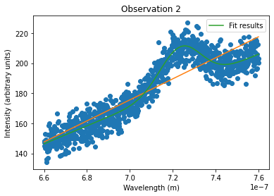 我得到了一个csv文件,它有一个波长,然后从那个波长观察到30个。我应该运行一些代码,将波长作为自变量,然后以1组观测值作为依赖变量。由此,我必须对数据拟合一个line+Gaussian函数,我可以把高斯的平均值(Mu)作为我需要更多分析的变量。为了得到一个很好的拟合,我必须找到一种方法来自动对高斯+线的参数进行初始猜测。我觉得我可能已经在某种程度上偶然发现了这一点,因为它为每一组观测生成的高斯拟合似乎非常适合。得到直线的梯度和y截距的一个很好的方法是为数据绘制一个线性拟合,并在gaussian+line拟合中使用m和c的值,但我不确定我是否正确地这样做了。