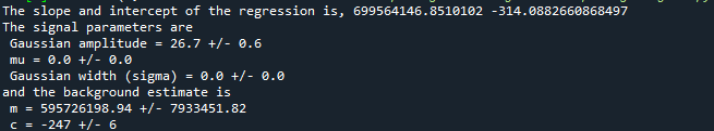 print(" Gaussian amplitude = %.1f +/- %.1f" %(po[0],sp.sqrt(po_cov[0,0])))
