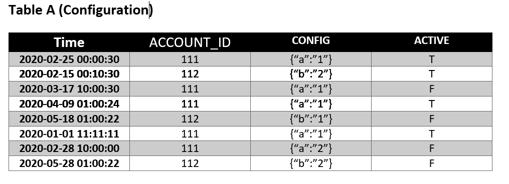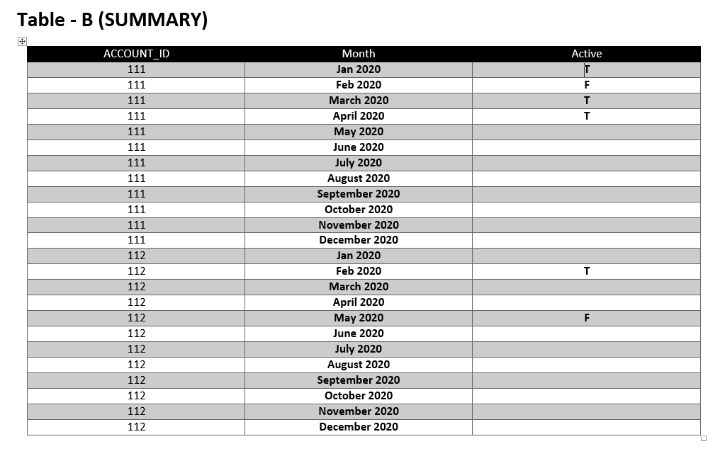 我想要生成如下所示的表。其思想是,对于表A(配置)中的每个不同的account_id,希望生成一个汇总表,以便每个account_id在日历年度的每个月都有一个汇总条目,该月份的最新/最后一个account_id条目决定帐户是否处于活动状态。对于没有特定月份分录的帐户,ACTIVE列的值将为空。