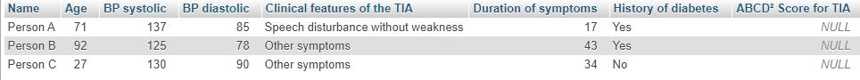 > Name     | Age | BP systolic | BP diastolic | Clinical features of the TIA        | Duration of symptoms | History of diabetes | ABCD² Score for TIA