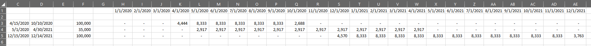 > =$F3/(12*DAY(EOMONTH(H$1,0)))*(IF(MONTH($C3)<=MONTH(H$1),IF(MONTH($C3)=MONTH(H$1),(EOMONTH($D3,0)-$D3),DAY(EOMONTH(H$1,0))),0))
