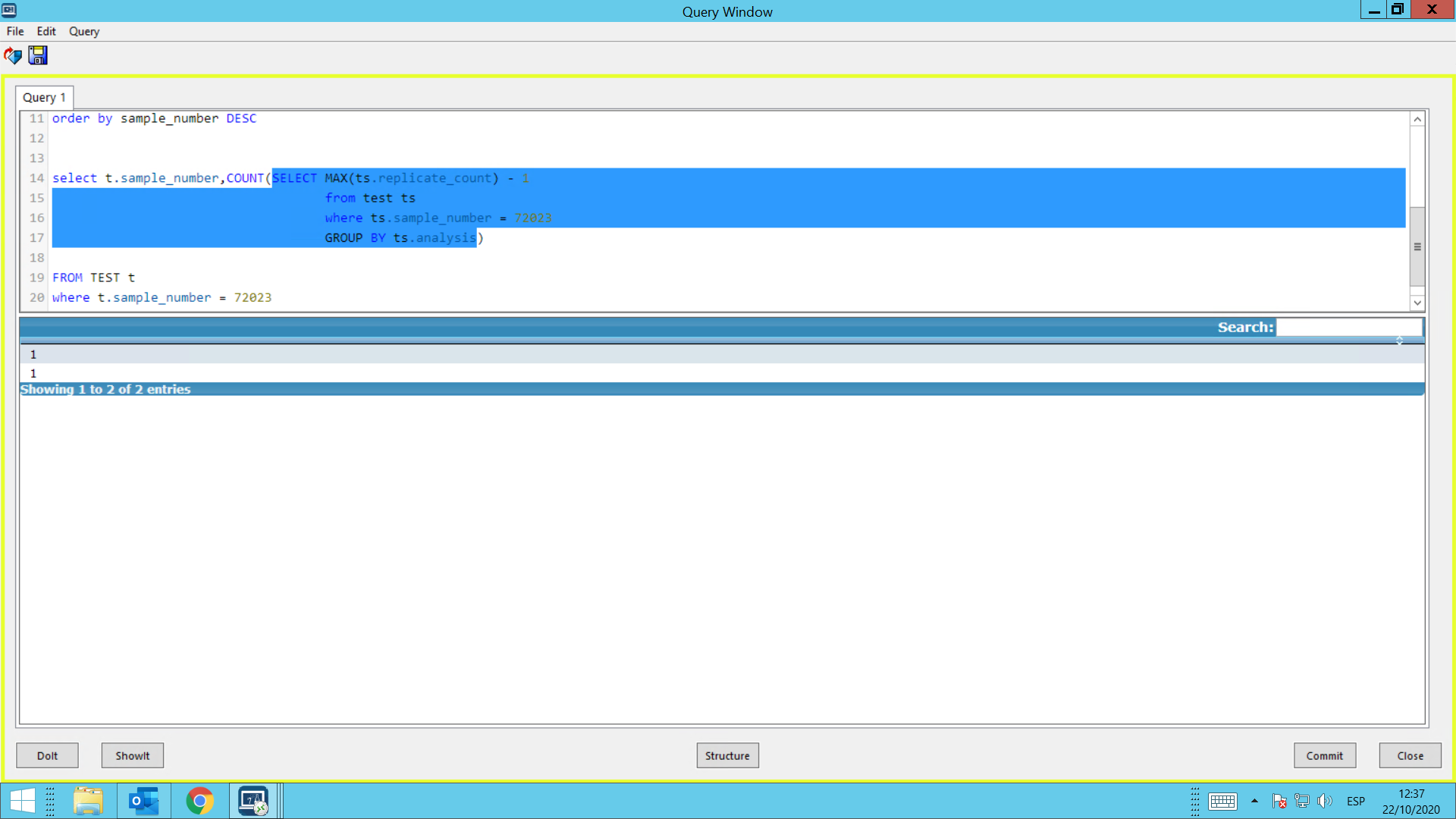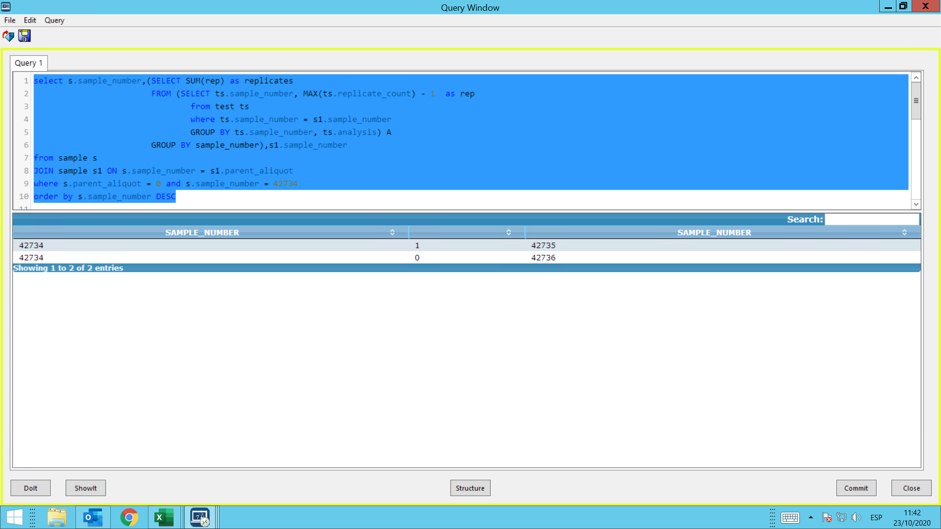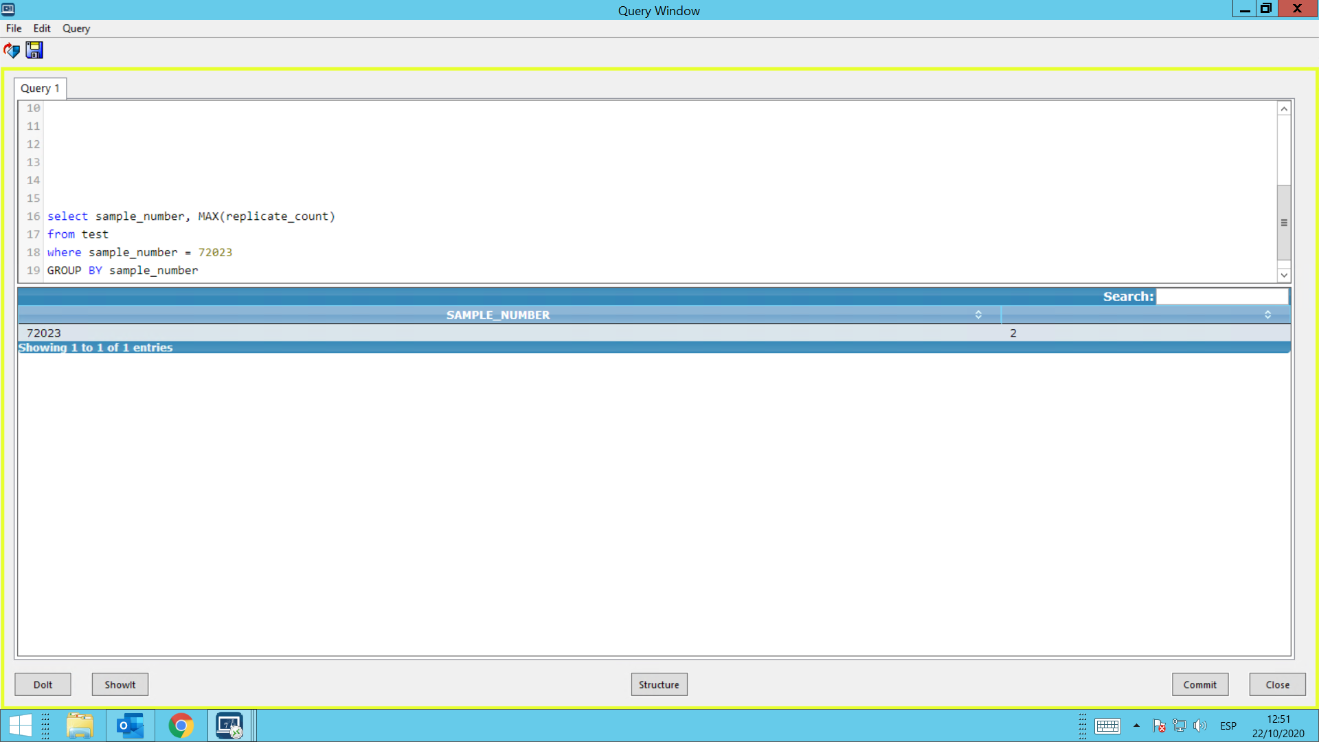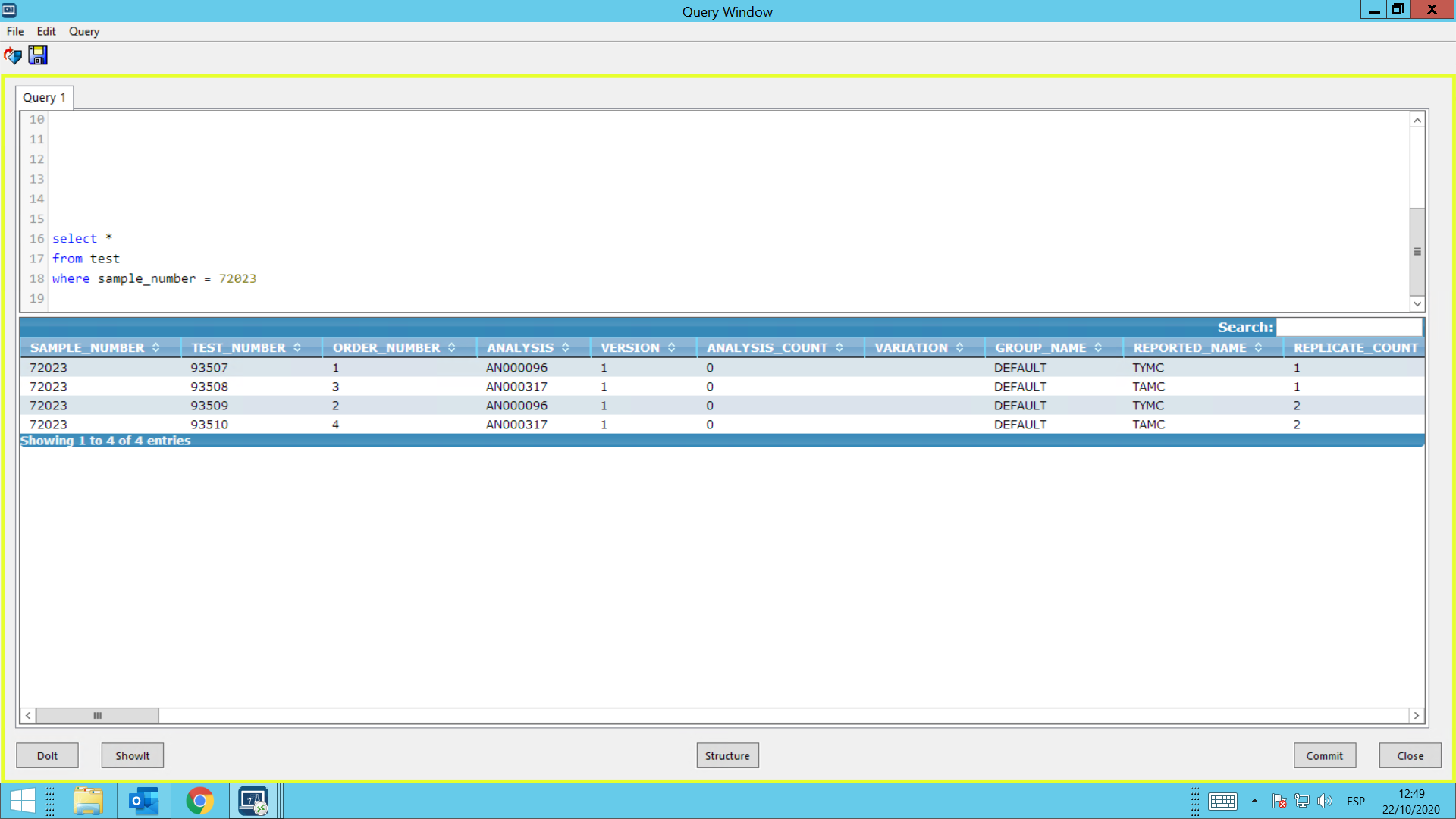 使用此查询,它将显示所述示例的复制量,并按分析对其进行分组。在这种情况下,由于样本72023有两个分析,它显示了两个结果: