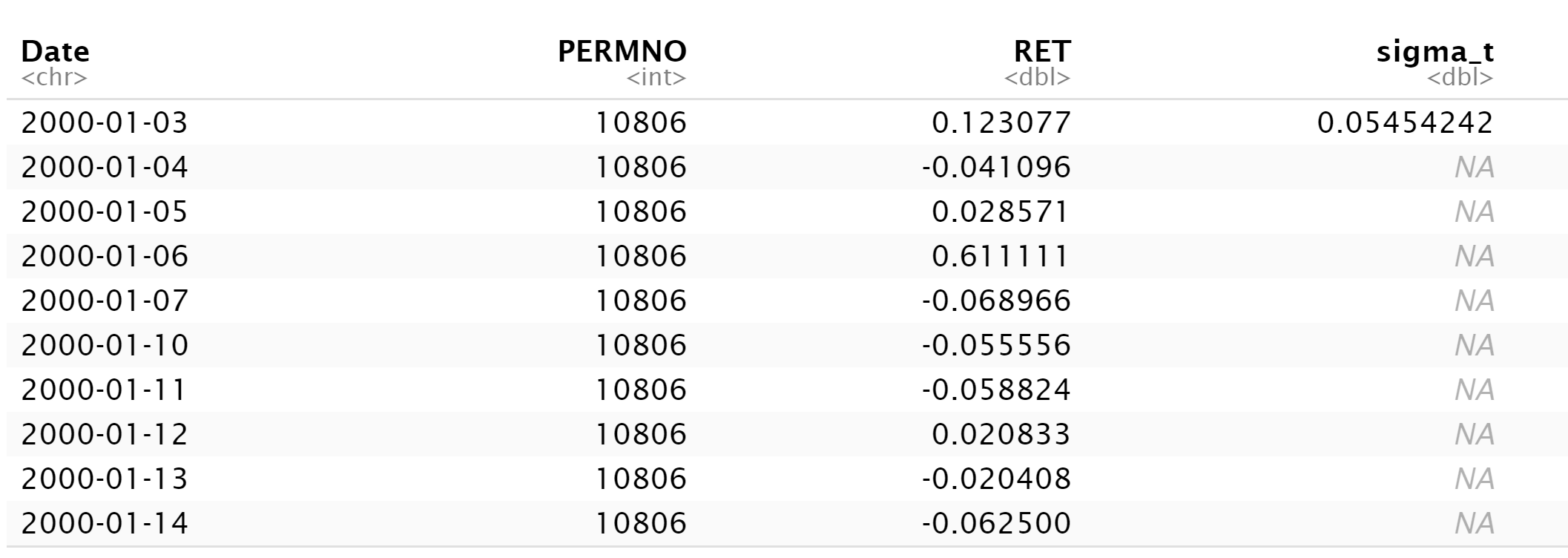 data %>% group_by(PERMNO) %>% mutate(sigma_t = accumulate(head(RET, -1L), ~0.94 * .x * .x + 0.06 * .y * .y, .init = sigma_t[[1L]]))输出