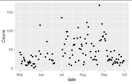 使用Tidyverse和lubridate,我们只需一个命令就可以完成所有您想做的事情,我们加载数据集,加上1973年,因为那是收集数据的年份。为整个日期创建一个新列,并将其发送到ggplot2图形。如果得到关于臭氧具有NA值的错误,可以使用来自ggplot2的ggplot2函数