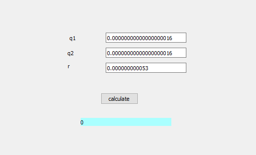 我试图计算c++ qt中两个电荷(库仑定律)之间的力。我有3行编辑,用户可以在其中键入数字(第一条线与点号1(q1)相关,第二条线条与点号2(q2)相关,第三条线条与两点电荷(R)之间的距离有关,用户点击按钮后,答案(两种电荷之间的力)出现在标签上。当我键入整数或大十进制数(例如0.25)时,代码工作正常,但当我键入非常小的小数(如0.00000000000000000016 )时,它返回0。有办法计算这么小的数字吗?