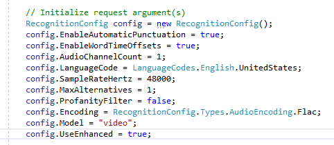 此外,在将语音请求配置为Text时,可以指定RecognitionConfig设置。该参数包含编码、sampleRateHertz、languageCode、maxAlternatives、profanityFilter和speechContext,每个参数对文件转录的准确性起着重要的作用。