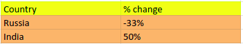如我们所见,与上周相比,Russia had a decrease in order count of 33%和India had an increase of 50%