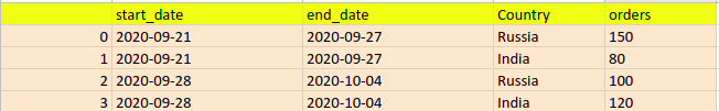 我有下面的数据,其中有country wise orders data of ,持续2周。我想在按国家、和end_date分组的情况下,计算出与上周相比,食品订单的百分比变化(增减)。