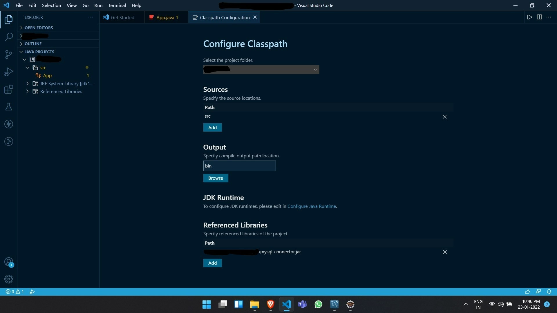 单击VSCode左侧资源管理器选项卡中的。然后右击您的项目名称,然后单击Classpath。这将在一个新选项卡中打开Classpath配置。滚动到底部,然后单击引用库上的add。这将打开资源管理器弹出窗口。选择java连接器jar文件,然后它就可以工作了。