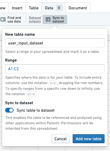 然后单击显示数据的选项卡,然后在下面找到“同步到数据集”。单击它并在弹出窗口中选择您想要的范围。在本例中,我们需要A1:C2。我给它取名为"user_input_dataset“