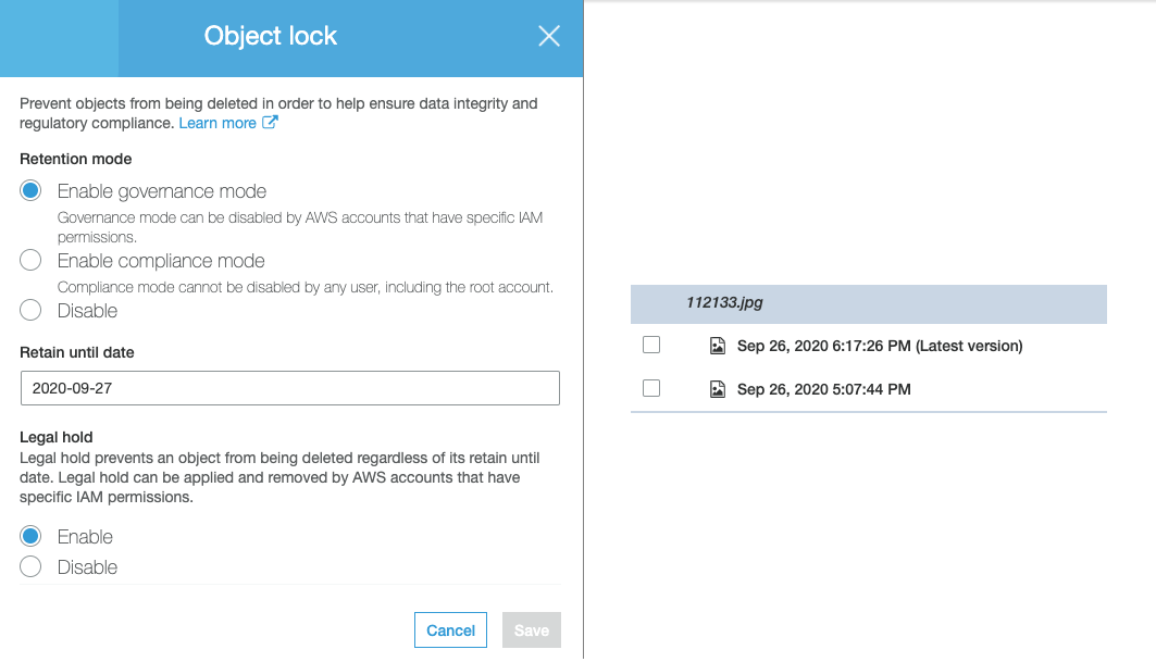 最近,我在S3上工作,玩S3对象锁的游戏。因此,我为特定对象启用了S3对象锁,并使用了治理模式和合法持有方式。现在,当我试图使用以下CLI命令用同一个文件覆盖对象时: