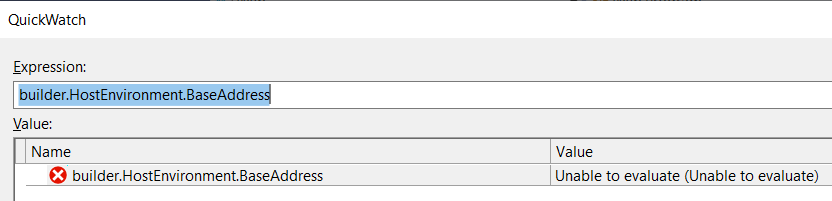 <PackageReference Include="Microsoft.AspNetCore.Components.WebAssembly.Server" Version="5.0.4" />一切正常运行,断点被击中,但在我更改该行之前,所有变量都会在Quickwatch中显示“无法评估(无法评估)”,而在编辑器中悬停则没有显示任何内容。
