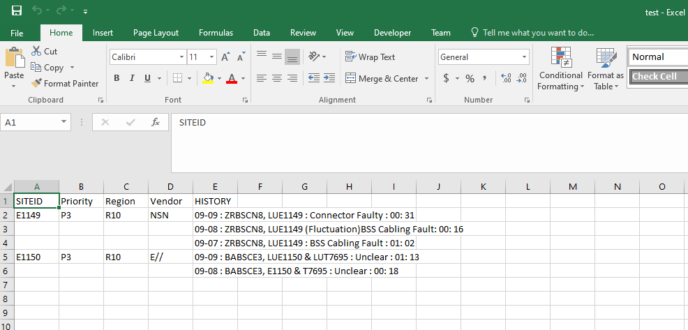 首先,我想将每个siteID的前四列(SITEID、优先级、区域和供应商)合并,然后将所有相关记录放在History列中,如下所示: