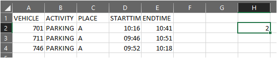 VEHICLE ACTIVITY PLACE STARTTIME ENDTIME
