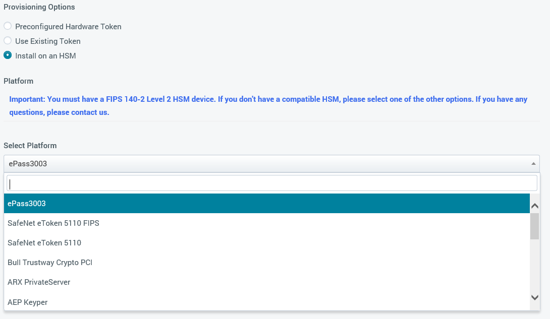 基于这个文章,我理解我需要确保我购买了一个启用HSM的证书。选择HSM时,选择的提供者是询问证书将在哪个平台上使用。