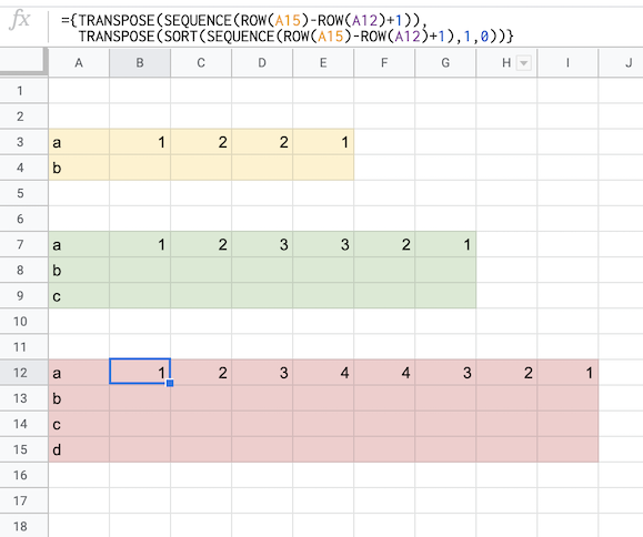 ={TRANSPOSE(SEQUENCE(COUNTUNIQUE(A12:A15)+1)),