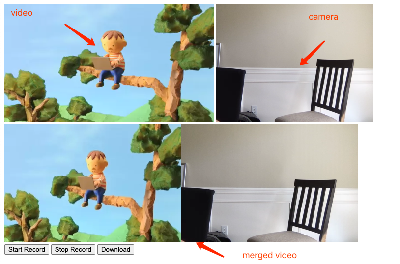 我想记录/生成一个视频在浏览器(特别是Chrome)与定制视频(如.mp4,.webm)和相机并排录音。