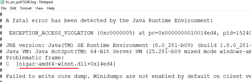 # C [sigar-amd64-winnt.dll+0x14ed4]