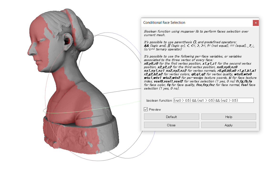 下面的图像是样本来选择每个顶点的z分量大于0.5的面。红脸是被选中的。在这种情况下,您可以按下“删除”键删除面部:
