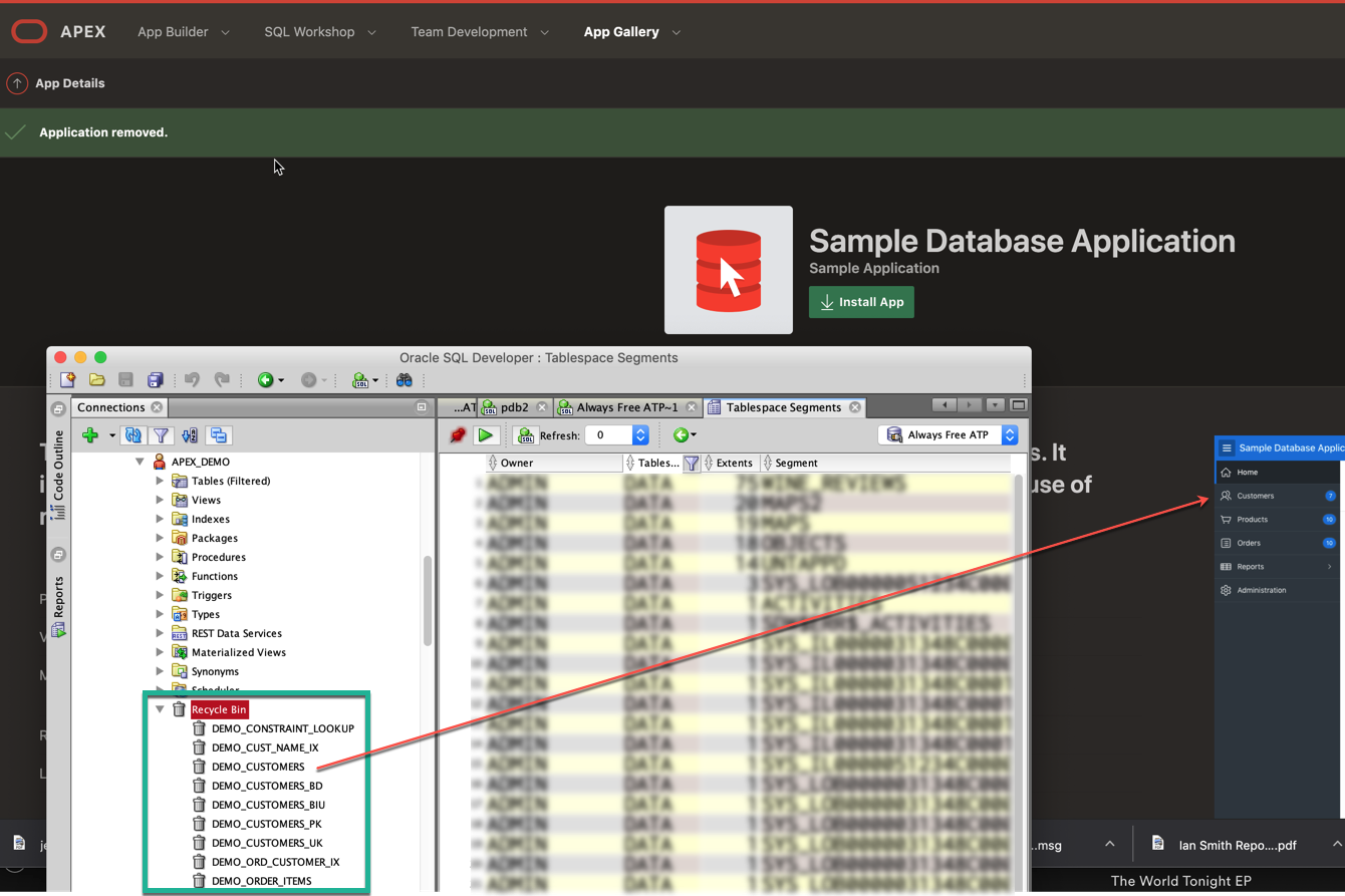 当您删除示例应用程序时,所有内容都会“删除”--但是,如果您创建了一个新的用户/模式来保存您的应用程序,则不会删除。