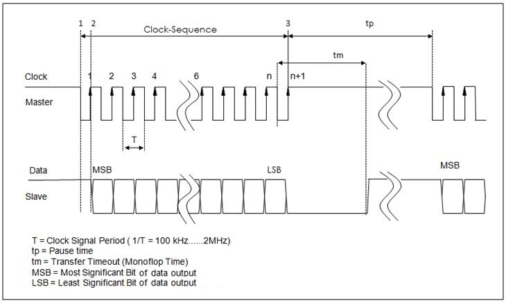为了传输N位的数据,主处理器发出N个时钟周期,然后是另一个时钟脉冲来发出信号传输的结束(所谓的"Monoflop时间“-指SSI接口的原始硬件实现)。由于SPI协议/ SPI从站不知道这个额外的时钟脉冲,因此它开始输出下一个数据字节的第一个位,而SSI主程序又无法识别它。因此,这将导致在下一个SSI帧上由SSI主服务器识别的数据位的移动。