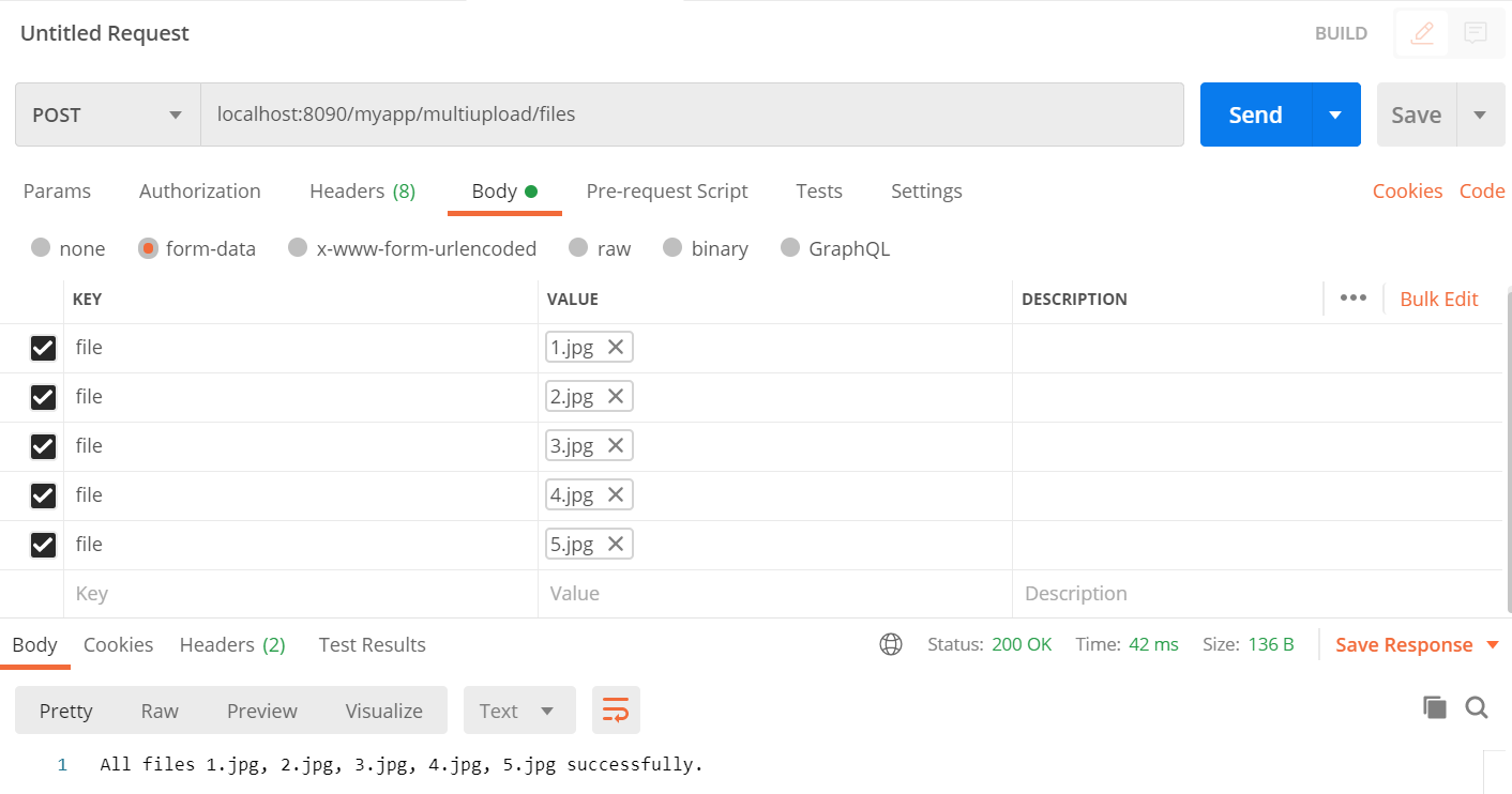 return Response.ok().entity("All files " + uploadedFileNames + " successfully.").build();